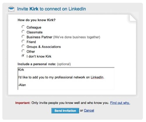 Now in LinkedIn I can get to her profile and then try the logic of “Add Lynette to Your Network”. Seeing the list of options (note these screenshots say “Kirk” because I finally managed to get LinkedIn and needed to snap the original screen).