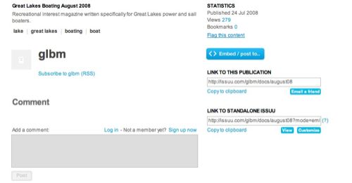 Its language revolves around sharing “magazines”, like Great Lakes Boating August 2008 issue– it is rich graphics, the pages flip when you turn them, you can zoom in and pan, etc: