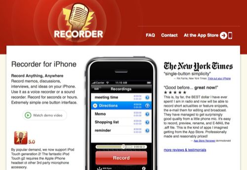 This is so easy, elegant, and powerful. Combined with the image recognition of SnapTell, audio sampling/identification of Shazam, this sexy device now has one more feature for media-work, built in interview recorder. Once the video recorder becomes a feature not requiring jail breaking, it will be almost complete.