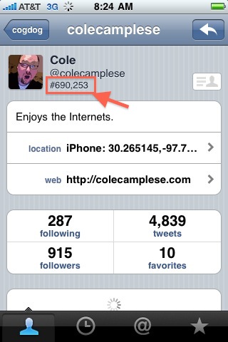 I looked at a few accounts I know are recent (this year), and sure enough they are in the #16,000,000’s. And then I looked at Cole Camplese‘s profile, cause I more or less followed him in January 2007 when he started blogging about twitter: