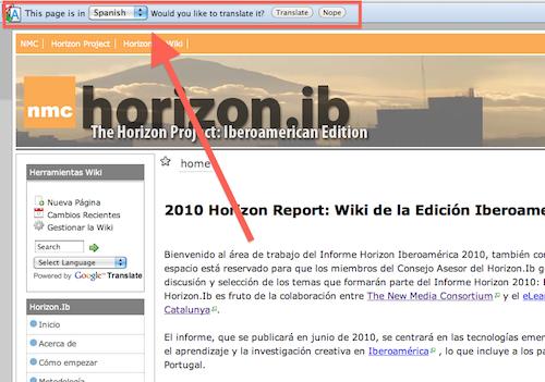 But wait there is more… A few weeks ago I started experimenting with adding Google Translation to our NMC web sites. This was really for one of our new Horizon Projects that is doing a new report for Spanish speaking countries, so all of the content is in Spanish. We had our wiki content translated, and Wikispaces nicely provides localization of the interface, so we have a nice Spanish wiki