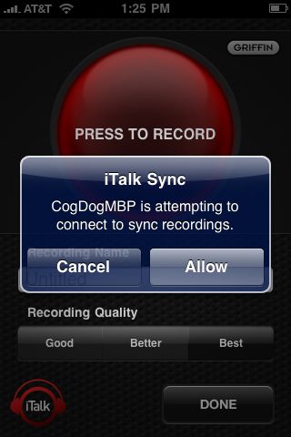 You can choose from 3 quality settings- for something to judge by, I did an 75 minute recording at Best settings (44.1 kHz) last week and it came in at 380 Mb. When you are done, you will want to move the file off the phone, right? We’ll you can email it (ugh, that is like sneaker net), but Griffin offers the free iTalkSync app (mac and windows).