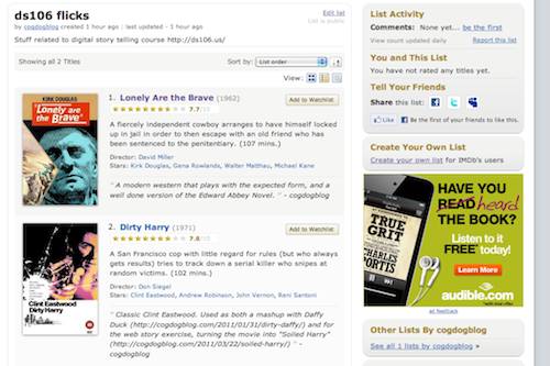 But there is more you can do- you can create other lists of movies on IMDb- so people are making lists of their favorites or collections of best comedies or worst horror movies, but I was thinking, there is something people can do related to ds106 -like as we move into the video, the movies they have watched for influence or ones they are using for projects– so I started my own ds106 one for movies related to projects I have done – this is a list you can make public and share via URL: