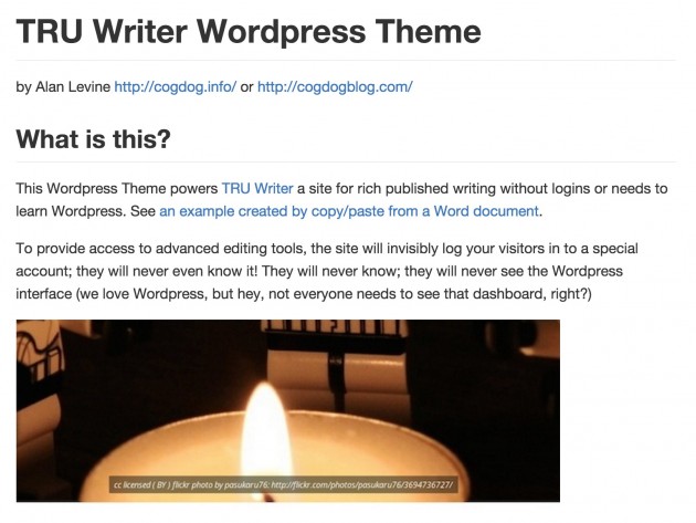 The TRU Writer is a tool for publishing to the web that uses WordPress as an engine, but never exposes the writer (lower case means the person, I loathe “user”) to the WordPress Dashbboard– they do not need accounts, and writers can choose to credit themselves by name, pseudonym, or just old fashioned Anonymous.