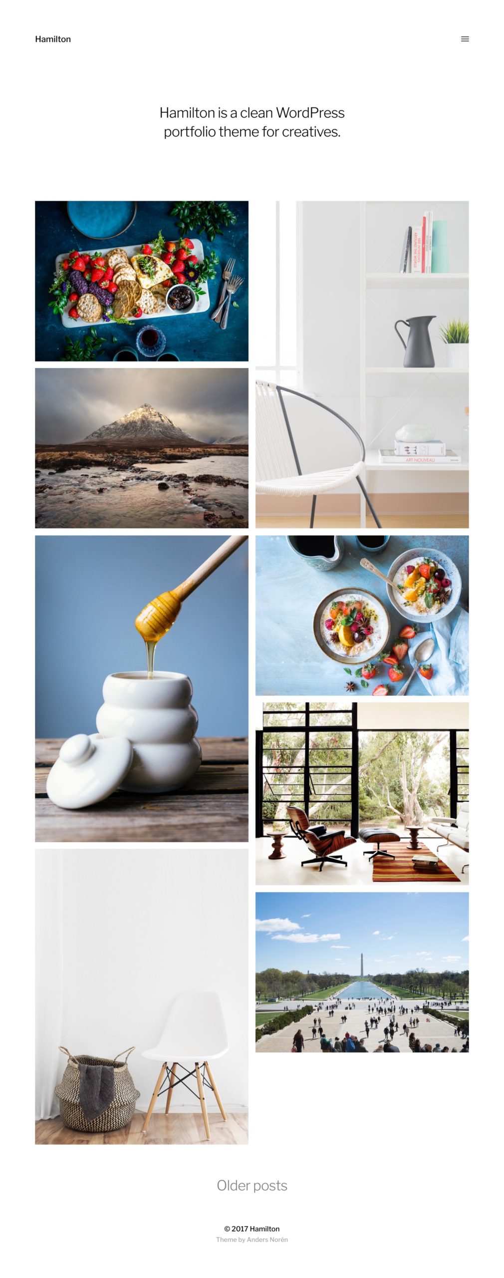 My first thought was like… almost any theme these days with some kind of masonry layout (links to content from featured images on the front page). But I had a thought of nice clever way he could do this himself, using a new theme from my favorite designer, Anders Noren, fashionably named Hamilton.