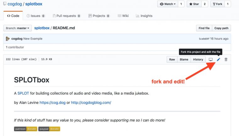 Hovering over the pencil icon (he knows that means edit, not chew), you see that it is labeled “fork and edit”: