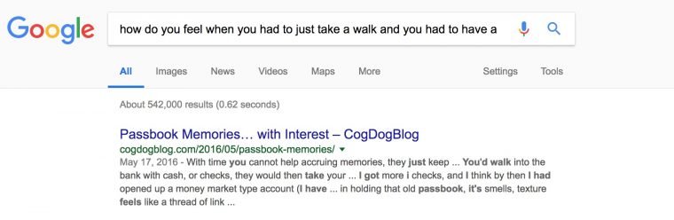 Does it mean something that my blog post is the first result for a search on ‘how do you feel when you had to just take a walk and you had to have a passbook?’