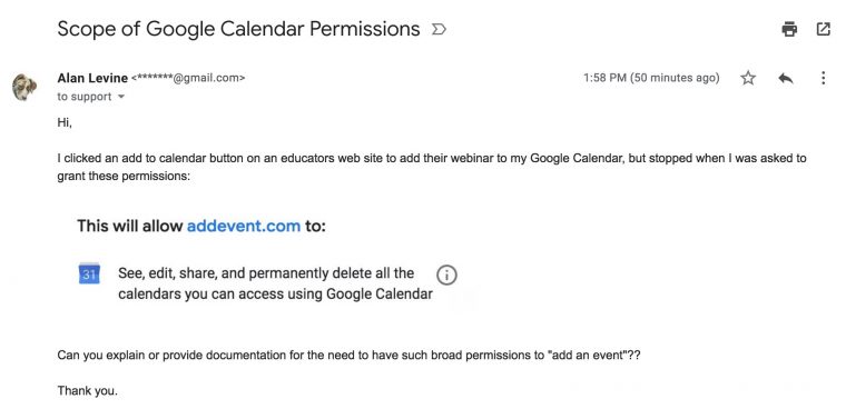And I almost added it to my Google calendar, because that would be easy, quick, and… HOLD THE EFFING BUS! Why would I grant such broad permissions to Addevent.com??