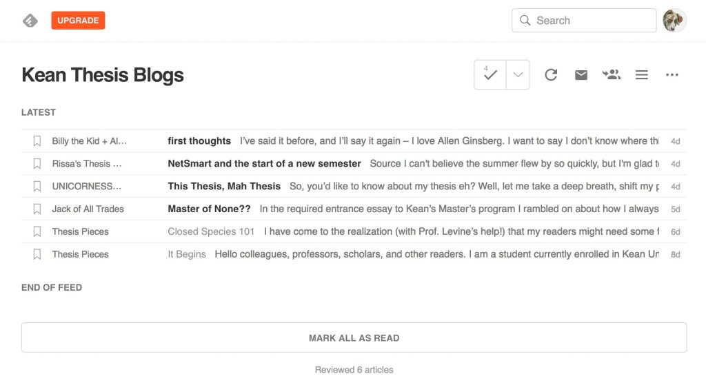 I’ve been thinking of a different approach, that means not building a web site, but having participants rig up their own syndication, using an old fashioned RSS Reader (ask your grandpa what they were). I started doing this last year in an MA Graduate Research seminar I led for a handful of students at Kean University.