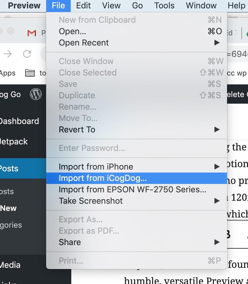 Anyhow, somewhere I found a solution I did not expect. Did you know the humble, versatile Preview app on an OS X machine can import stuff from your iPhone? Just jack it with USB, and inder the File menu is an item to import from my phone (it’s name is iCogDog).