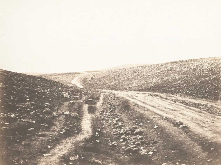 The initial story, the one that lead me here, centers on two photos of a desolate Crimean Valley in 1855, and whether the cannonballs were moved off the road or on to the road in the two photos taken the same day. Historians have used it to suggest photographer Fenton moved them onto the road to make for a more dramatic image of war. Faking photos in 2021 is something we do on the comfort of our devices, but in 1855 there was some physical labor involved. That is, if you follow that the photos were faked.