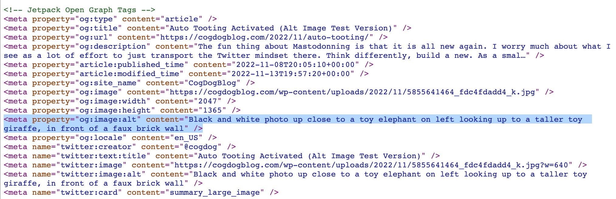 Source code of web page for my post showing opengraph tags, highlighting to show the one of interest -- meta property="og:image:alt" content="Black and white photo up close to a toy elephant on left looking up to a taller toy giraffe, in front of a faux brick wall"