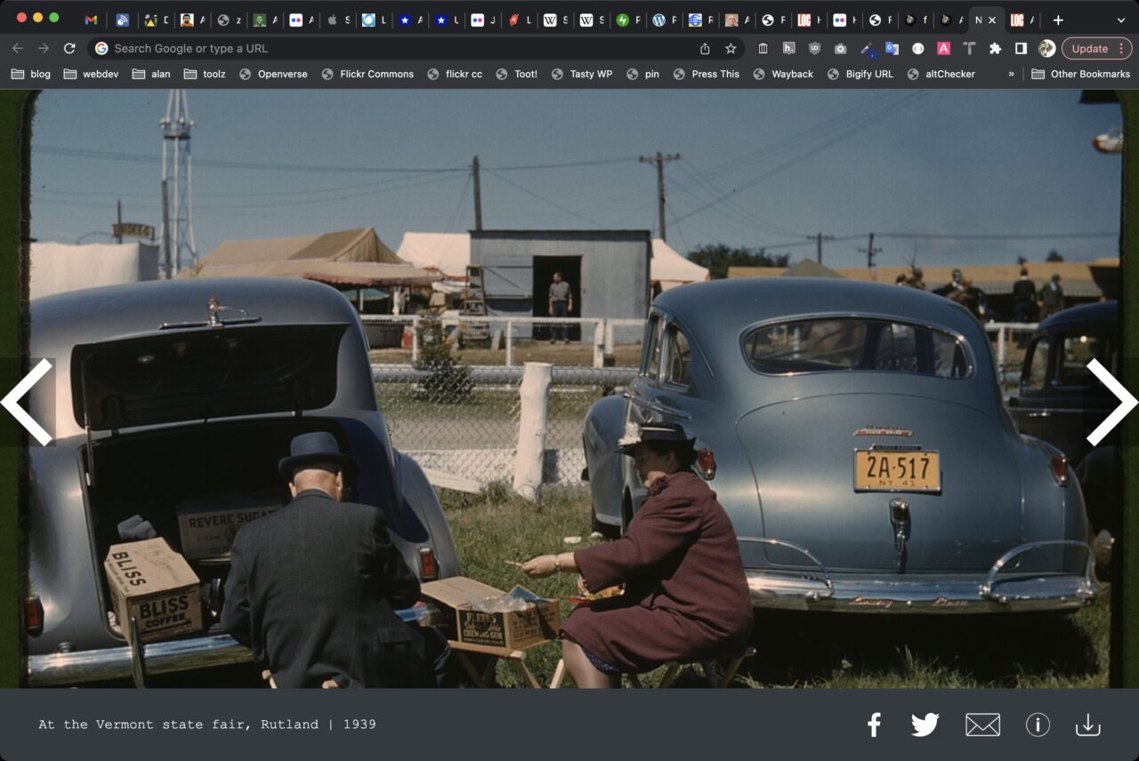 Often it gives me pause, or just makes me wonder about the story… here, I just opened a new tab and get a view of a man and a woman seated at the back of their classic cars at the State fair in Rutland, in 1939. I bet it’s Vermont, I’ve been to that town! I like it that they have a box of BLISS in the back.