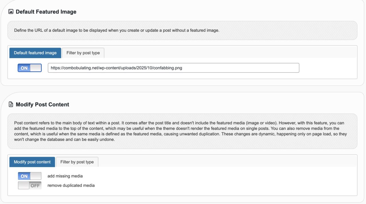 What used to work in the past was findind a plugin that created a feature image from the first image it found in a post. I used in the p,ast the adoringly named FWP-SIC-em plugin by the author of FWP– oh last updated 9 years ago. I remember that it chewed memory on DS106 and besides, on a quick test on one of my old sites, it crashed badly in PHP 8. I thought that Auto Featured Image (Auto Post Thumbnail) worked, but it struck out in my tests.