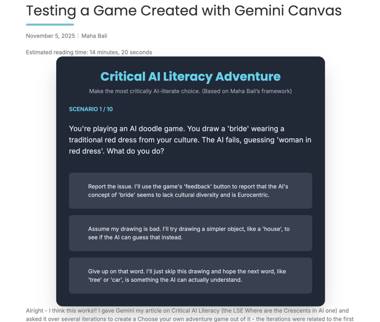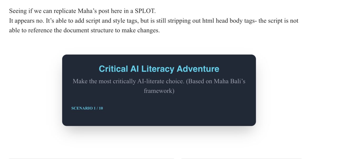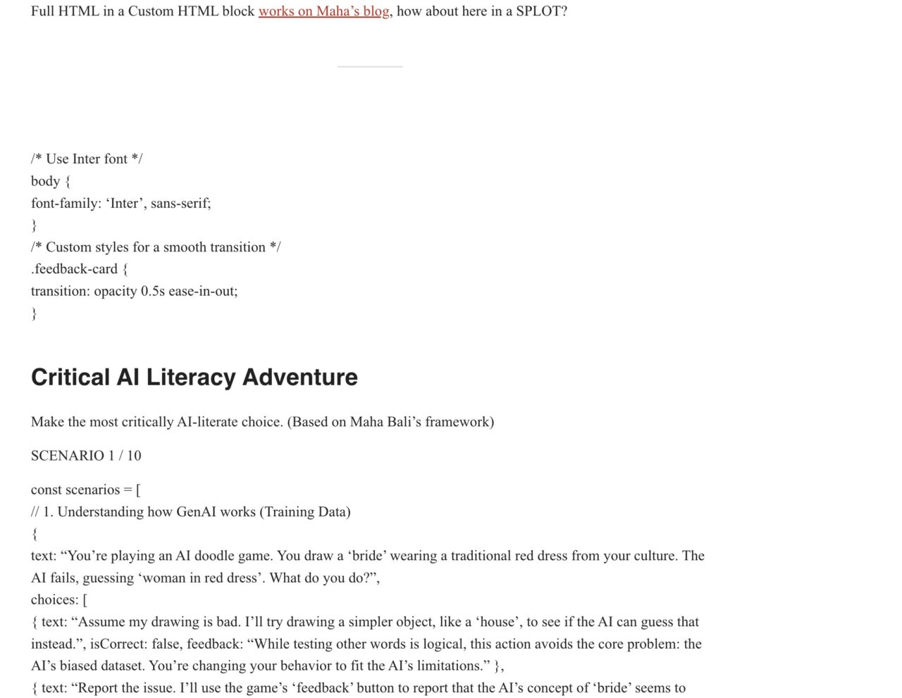 And I know from a recent email from Maha Bali that she uses TRU Writer for some of her class projects. In fact, she contacted me after sharing an example of an interactive activity spawned by Gemini AI that she was able to insert into her blog post using the HTML code it provided (standalone HTML file with CSS and Javascript inside).