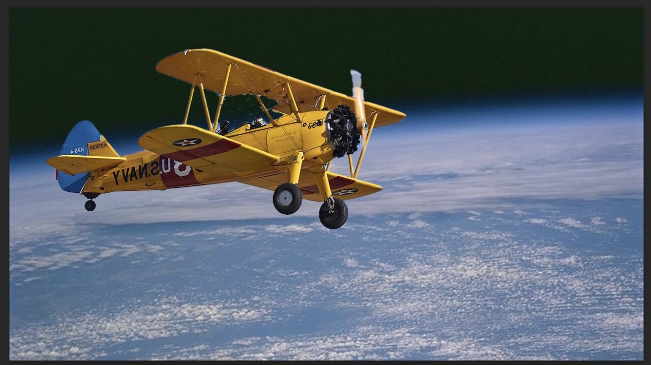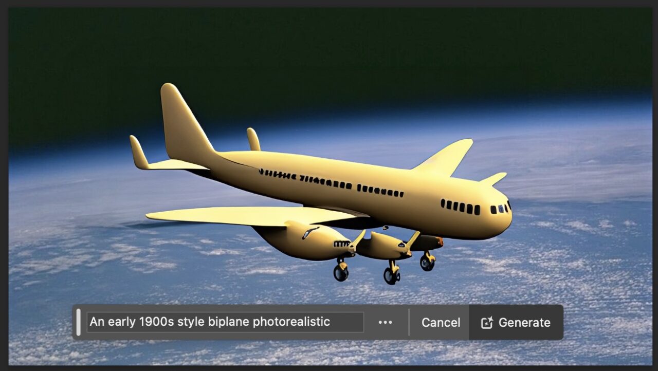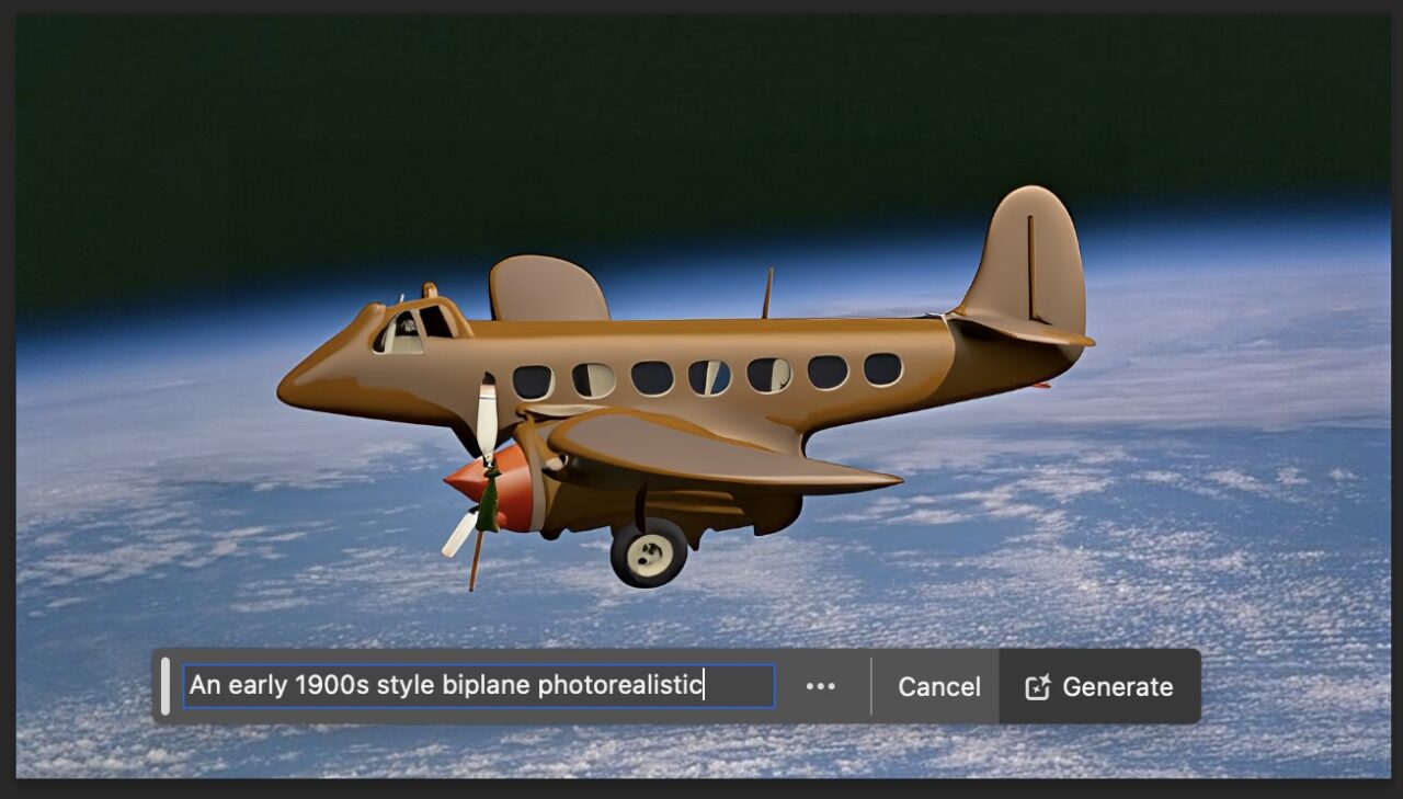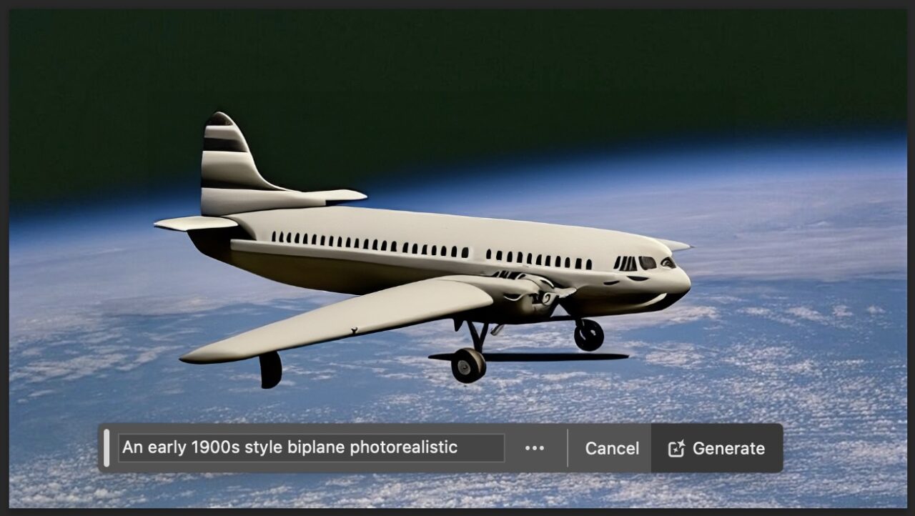 What I never try or do is have it create image elements for me, but I wondered how well it could do… maybe put like an early 1900s biplane in orbit? I asked it to generate “An early 1900s style biplane photorealistic” – that is pretty clear?