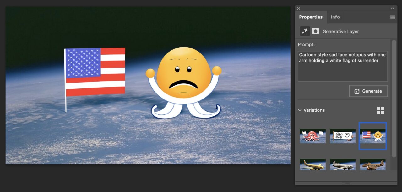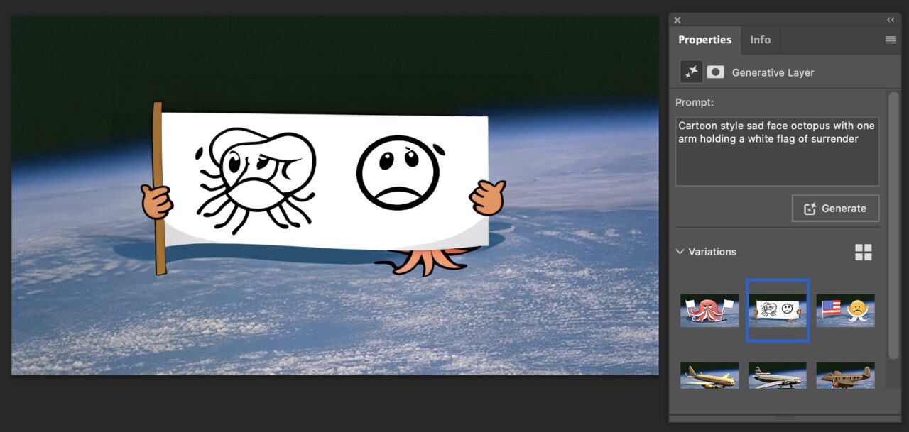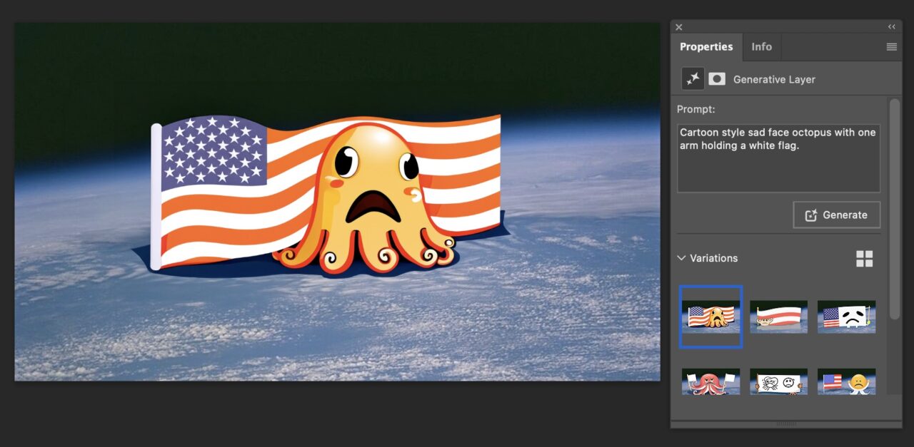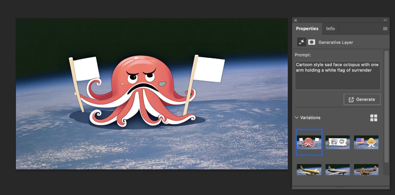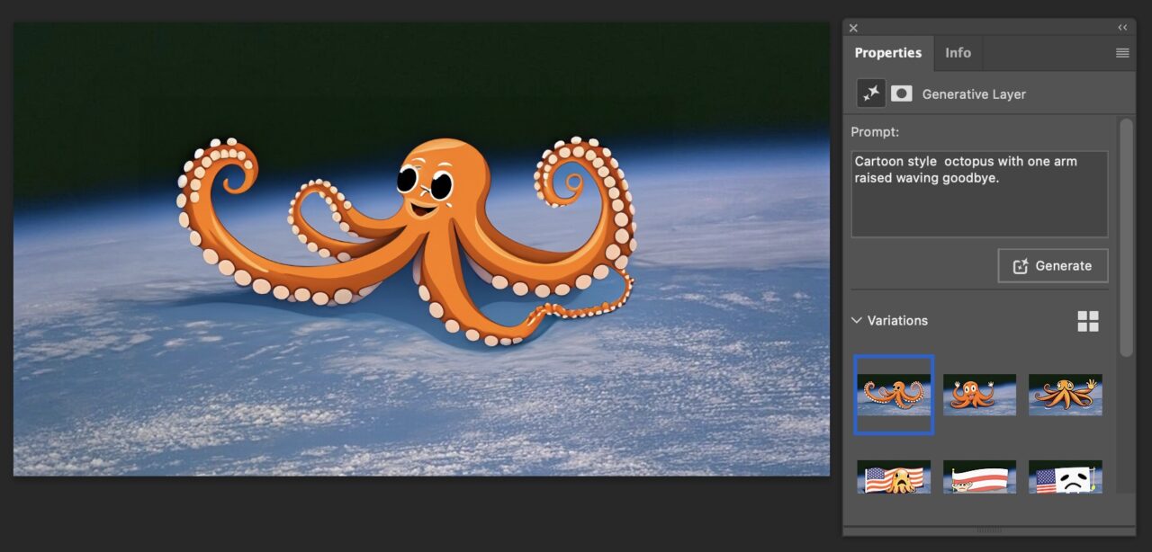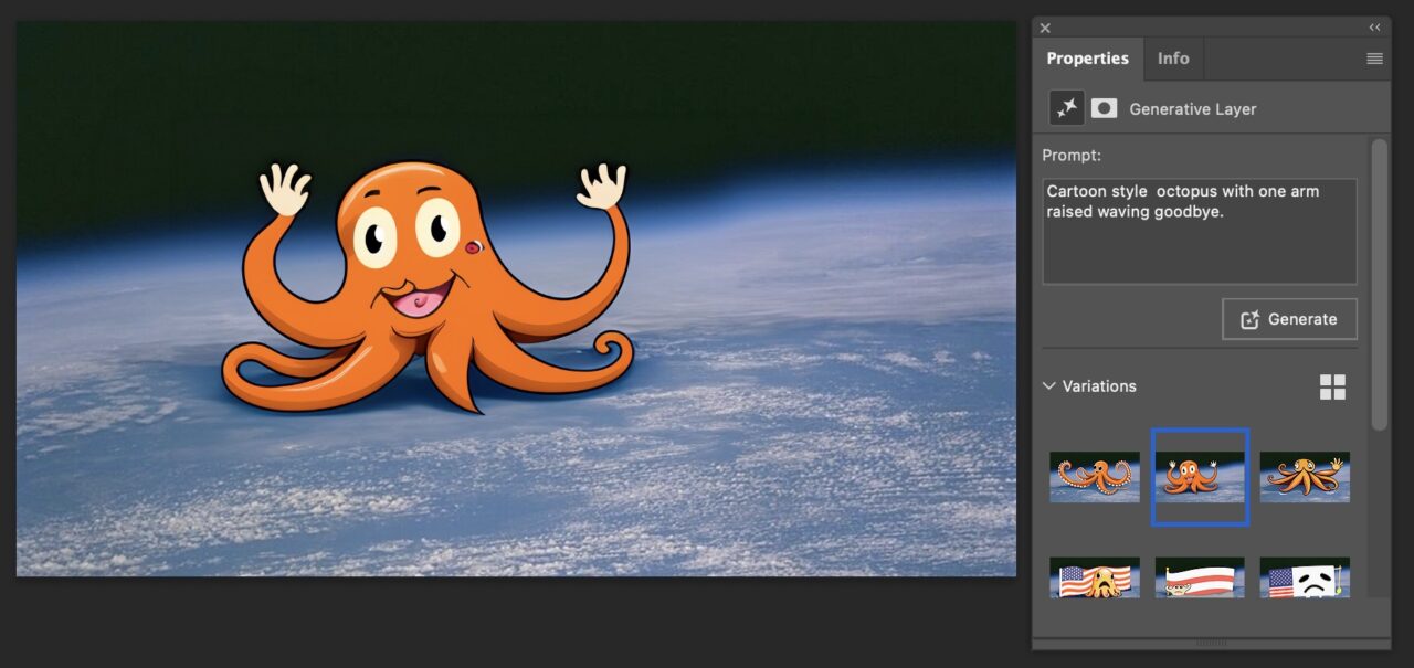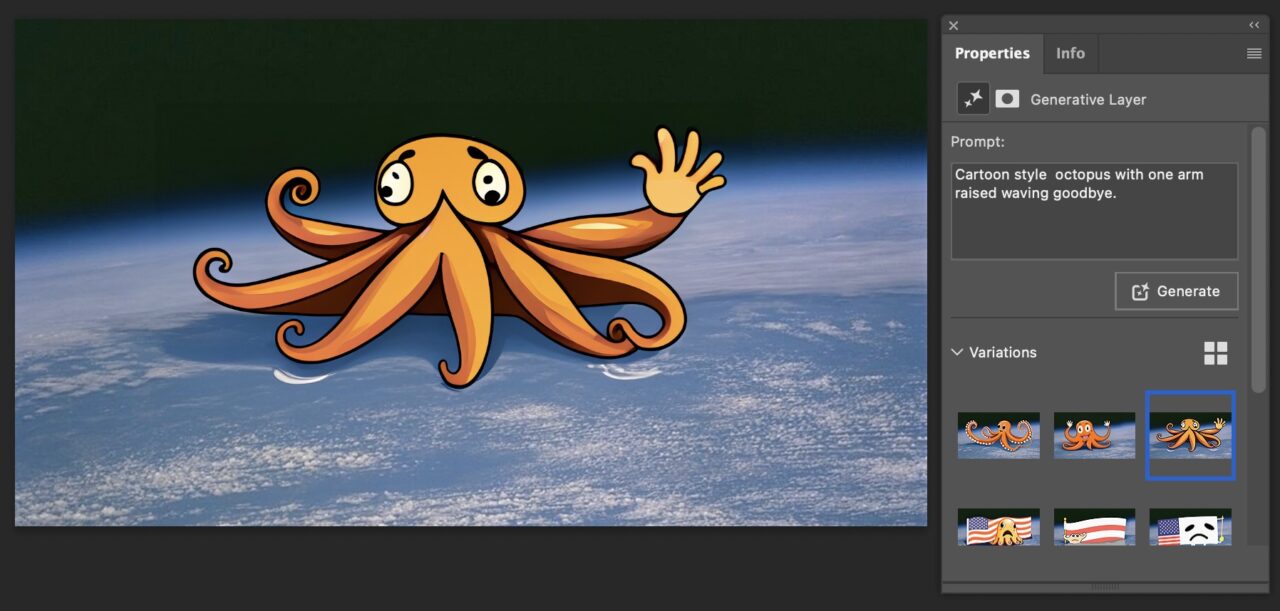Surely Generative Fill can handle “Cartoon style octopus with one arm raised waving goodbye.” Yes I am calling it Shirley.