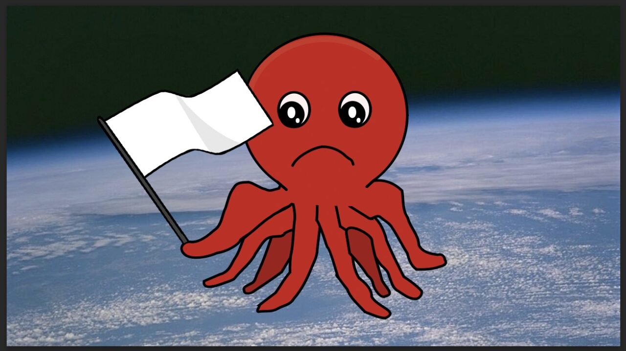 Cartoon style sad face octopus with one arm holding a white flag of surrender.” Look at this “art”