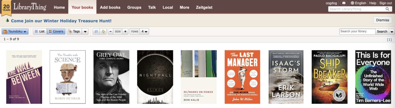 But what do you know, LibraryThing is still there, I found my login and started trying to remember all the things it did. As it turns out I have a few Tsundoku piles, I took some quick photos, and in no time had added them to my LibraryThing account — hee hee in a new “collection” I created named Tsundoku. Here is my wall of unread shame.