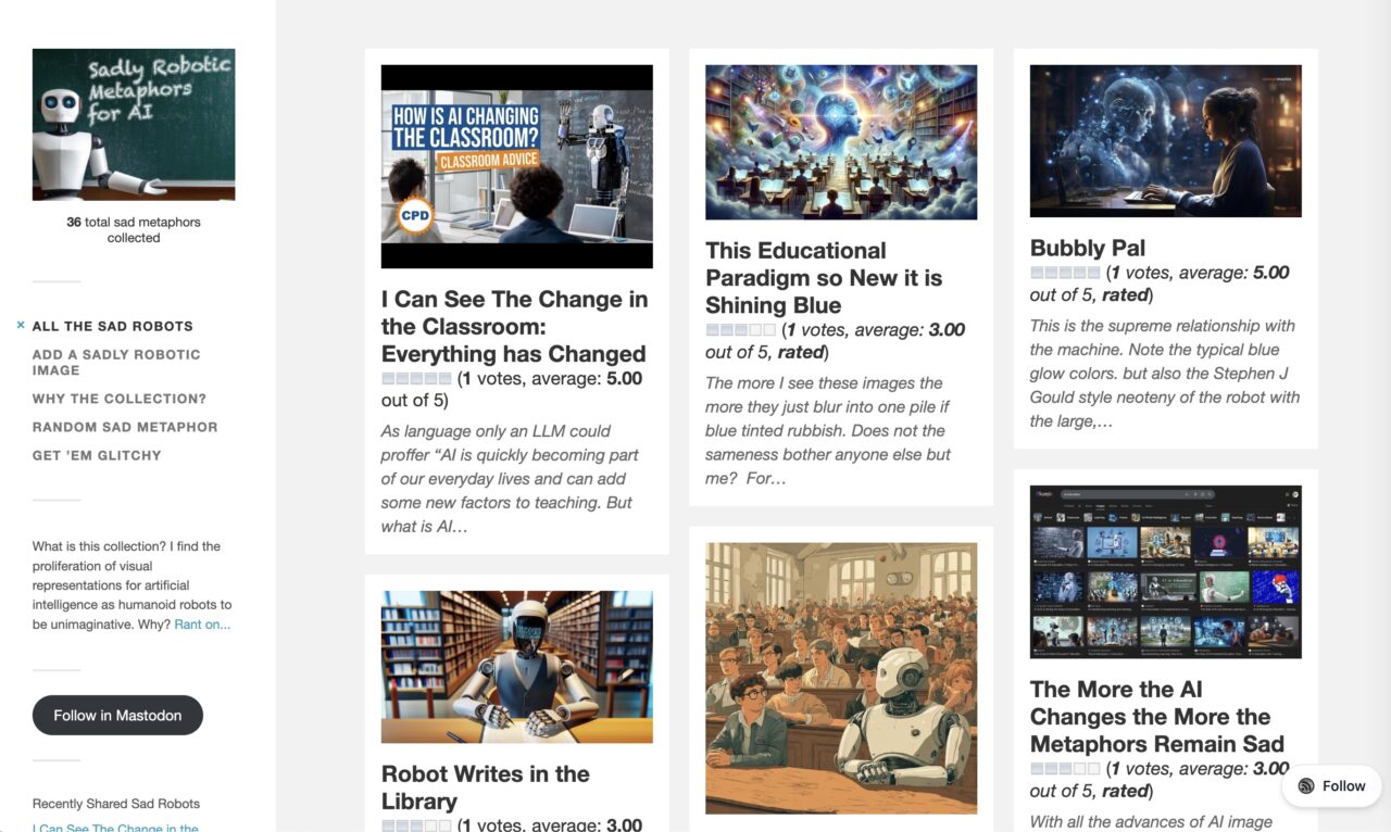 With my disgust over the fawning embrace of GenAI, especially the generators of lame imagery, I was hopeful my pitch at a collection site of Sadly Robotic Metaphors of AI might get a few contributions.