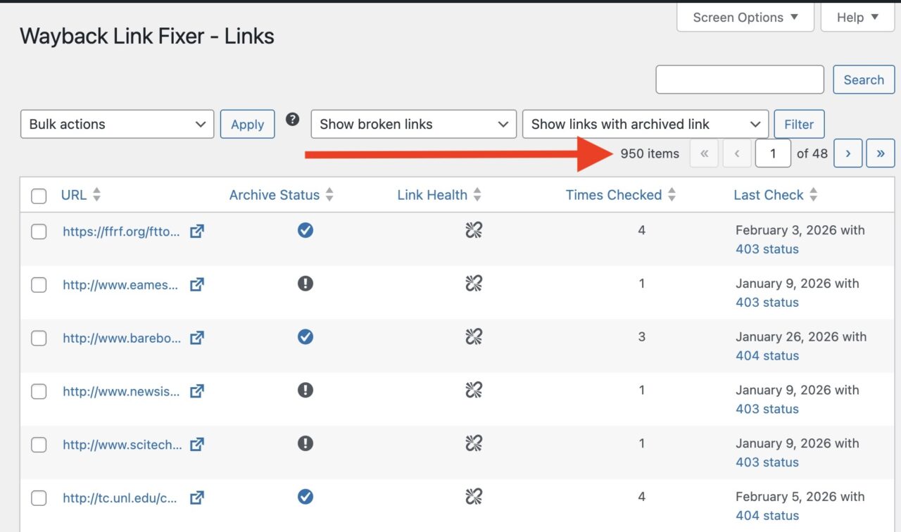 If I look in at the list of Links, by setting the filter options for Show Broken Links and Show Links with Archived Links I think I confirm that it has automatically update 950 of my dead links.
