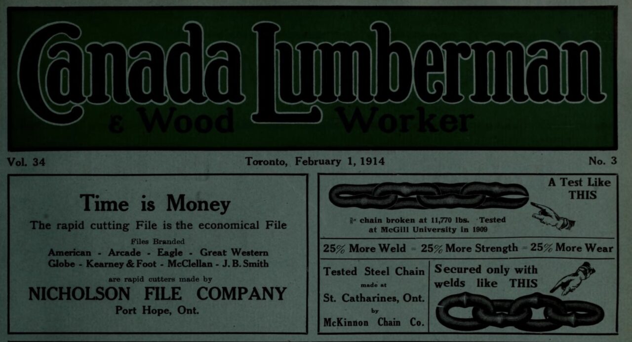 Featured Image: From Image from page 170 of “Canadian forest industries January-June 1914” (1914) flickr photo by Internet Archive Book Images shared into the public domain using Creative Commons Public Domain Dedication (CC0) a larger screenshot of the 1913 Canadian Lumberman page it is taken from.