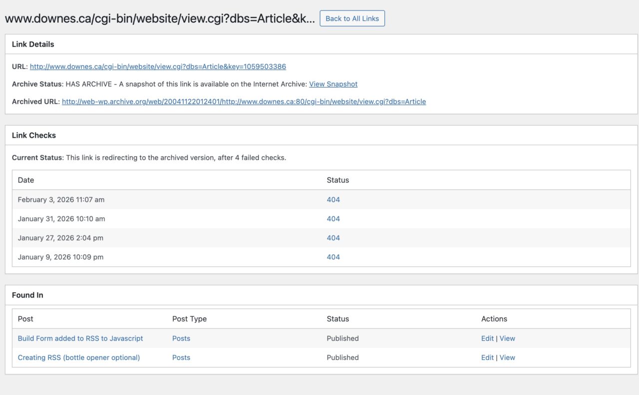 I need something like this for my own database – I have posted some 38,000 links over the years in my newsletter, and many of them are dead. But I’d live to just add a link to the correct Wayback version, if it exists. I’m not using WordPress, tho…