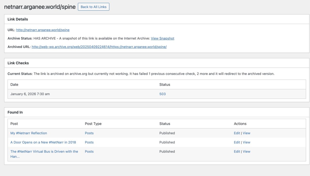 It also provides insight into links that are not dead, for example I can see that I have used the link netnarr.arganee.world/spine (which works and also has an archive link) in three different blog posts.